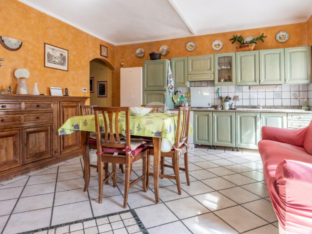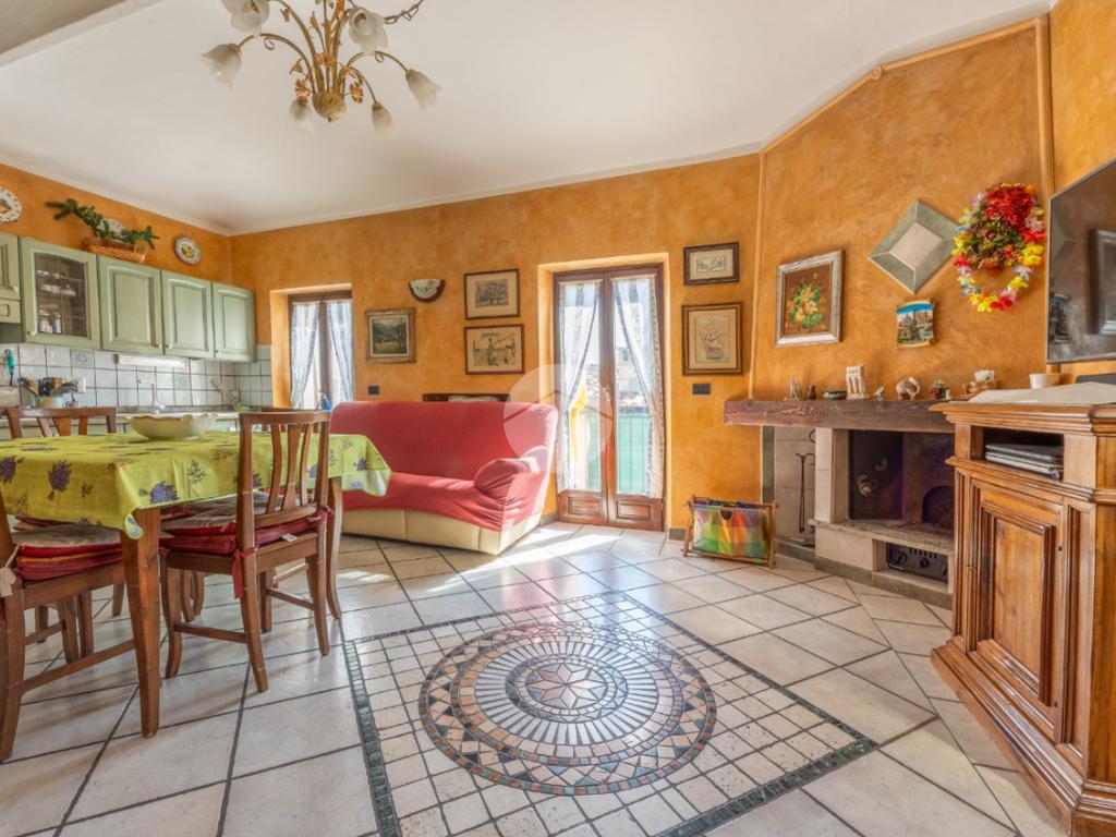 L’ingresso si apre su un ampio e accogliente open space con cucina a vista e camino a legna.